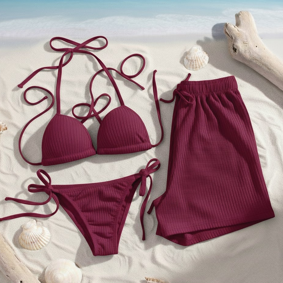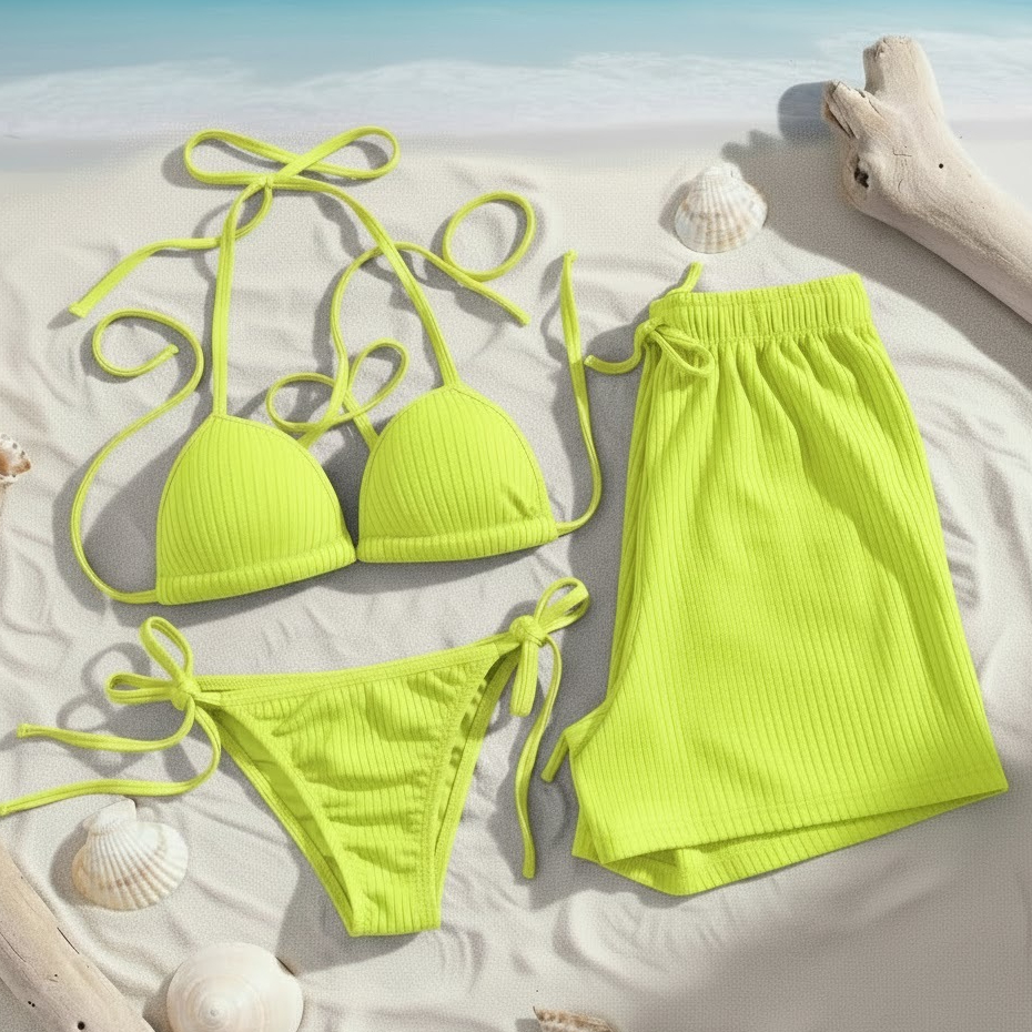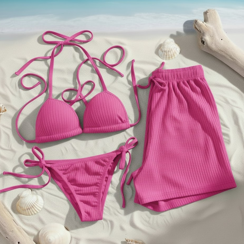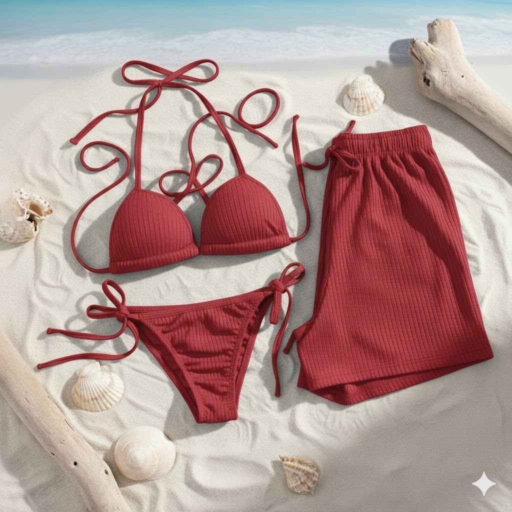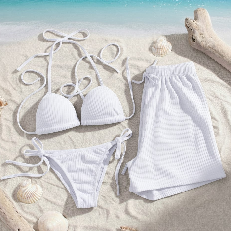 KIT 3 PEÇAS LUXO: Biquíni Completo Canelado + Short Soltinho | Versatilidade e Tendência Verão